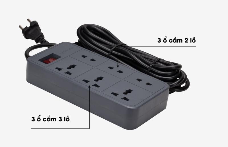 - Sản phẩm thiết kế có 3 ổ cắm 3 lỗ và 3 ổ cắm 2 lỗ đa năng, phù hợp với hầu hết các phích cắm dân dụng