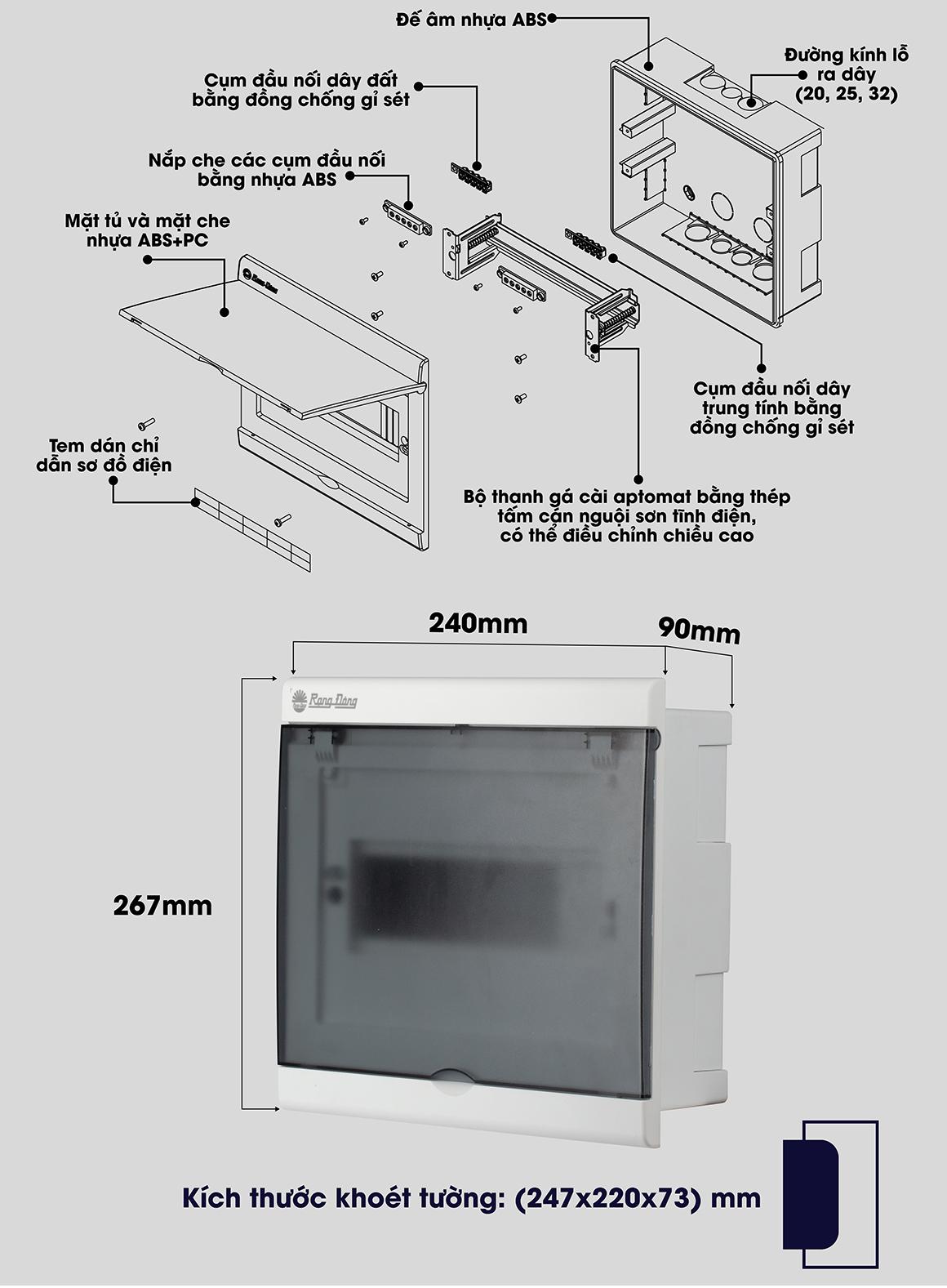 - Phù hợp lắp aptomat ngắn mạch RD.MCB Rạng Đông và các tép aptomat kích thước 18mm trên thị trường.
