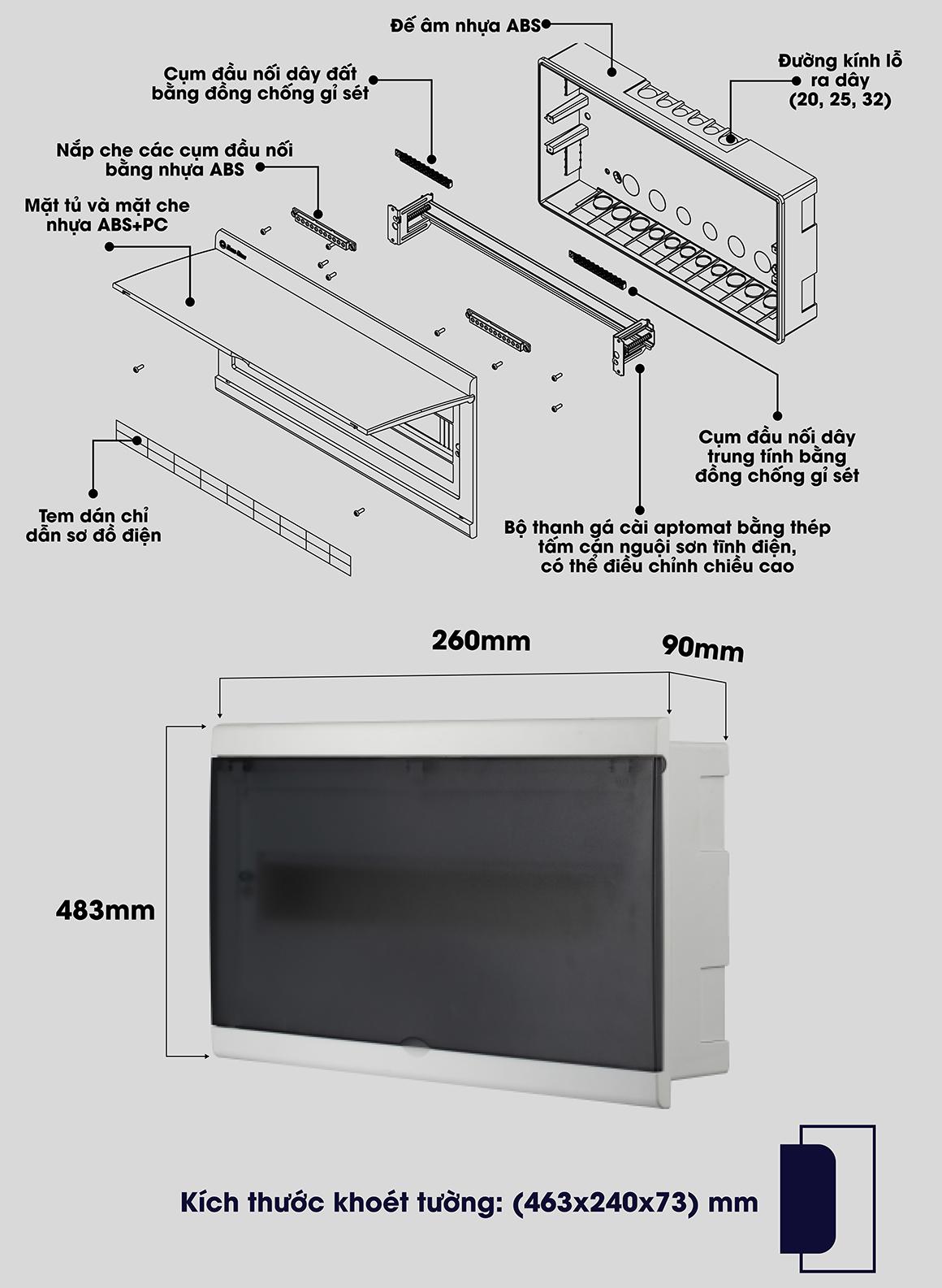 + 22 modules Kích thước: 483 x 260 x 90 (±5 mm), Kích thước khoét tường: 463 x 240 x 73 (±5 mm)
