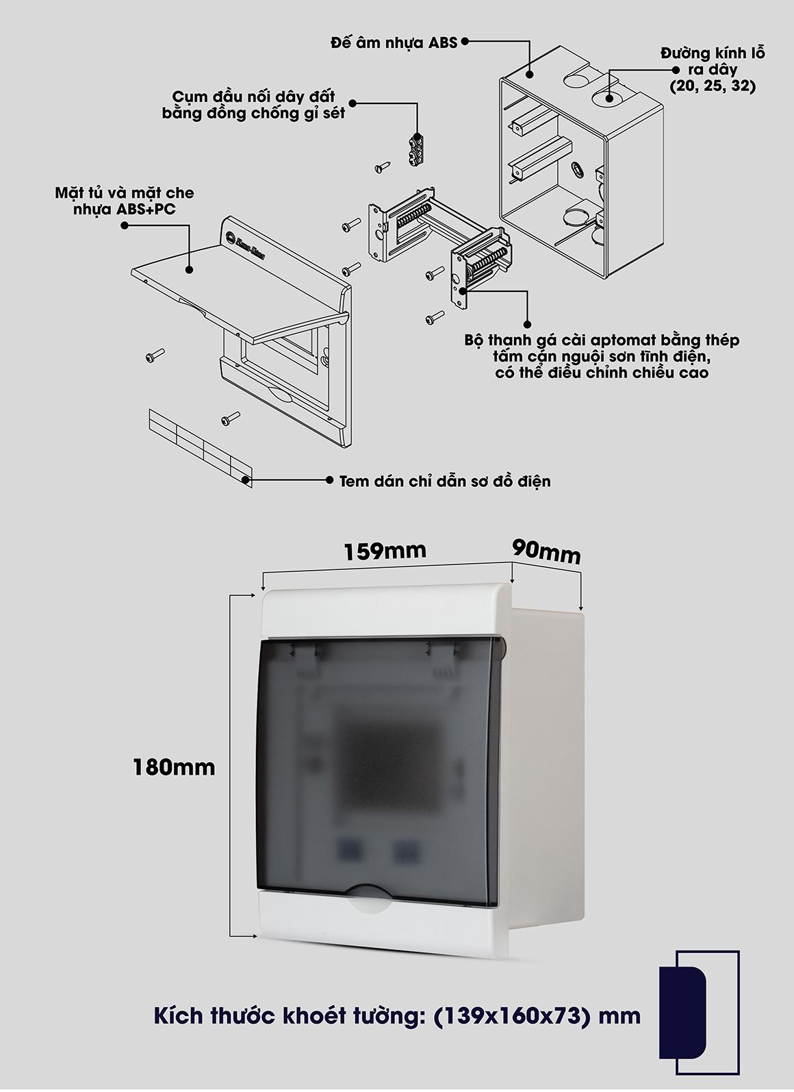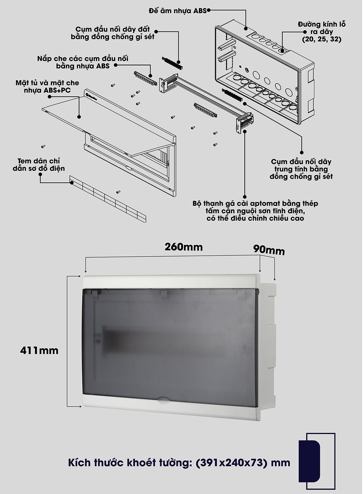 + 18 modules Kích thước: 411 x 260 x 90 (±5 mm), Kích thước khoét tường: 391 x 240 x 73 (±5 mm)